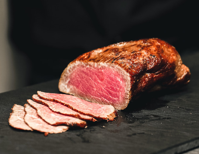 枯らし熟成肉の極上ローストビーフです。もちろん店舗で扱うものと同じ「枯らし熟成」した[ 黒毛和牛/A4等級/未経産メス牛 ]の条件を満たした希少な肉でつくっております。2年ほど前から、下味薬味の調整、火加減、保存方法の試行錯誤を繰り返してきましてこのたび新メニューとして登場です。