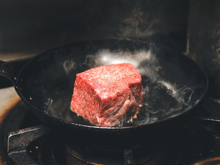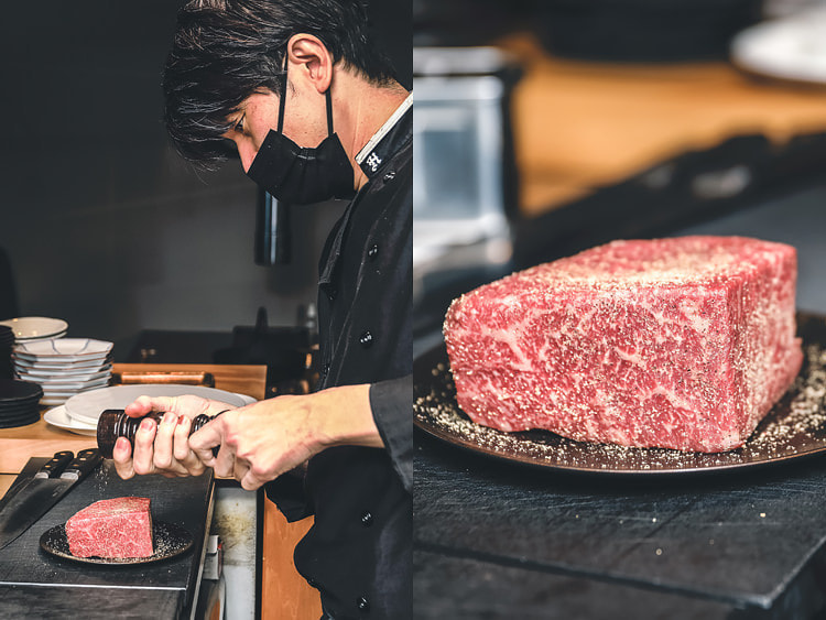 カットされたブロック肉には素材への浸透率が良く肉が本来持っている旨味を最大限に引き出すことが可能な「ピンク岩塩」と独自配分で調合した黒、白、赤の3色の胡椒を使用しております。