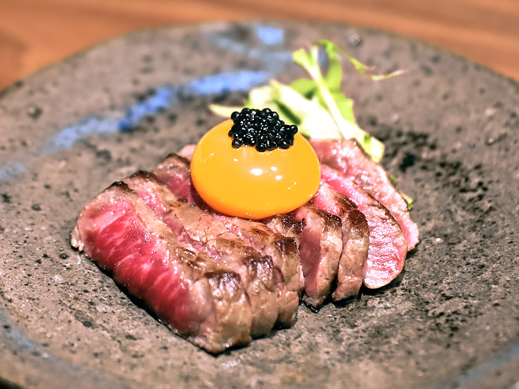冷製ステーキとキャビア。世界三大珍味(フォアグラ、キャビア、トリュフ)のひとつ、キャビアを赤身肉のステーキにあわせたメニューができました。枯らし熟成の赤身肉に合わせるのは「幻のキャビア」と言われる『ラトビア産スターレットキャビア』。塩気が少なく旨味をしっかり感じられるキャビアで、牛肉の旨味とキャビアの旨味、そして程よい塩分がお口の中に広がります。