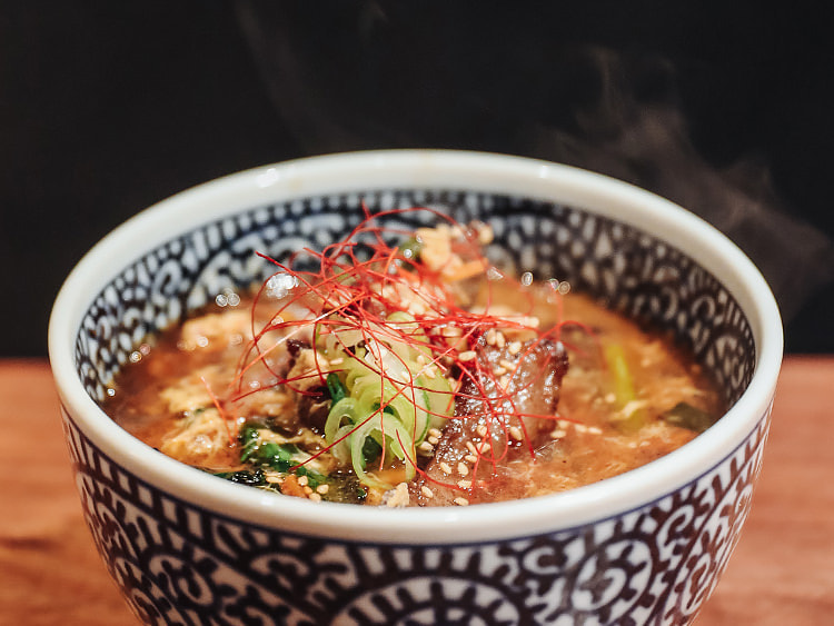 カルビクッパ・カルビ温麺。ピリッと辛く、枯らし熟成肉だからこその牛ダシ入りの食欲そそる旨辛スープごはん・麺です。いつものクッパ、温麺にタレ焼きカルビと特製ニラ薬味でアレンジしました。本格的に暑くなる前に良質なお肉でタンパク質と様々な栄養素を含むニラで夏バテ防止を。