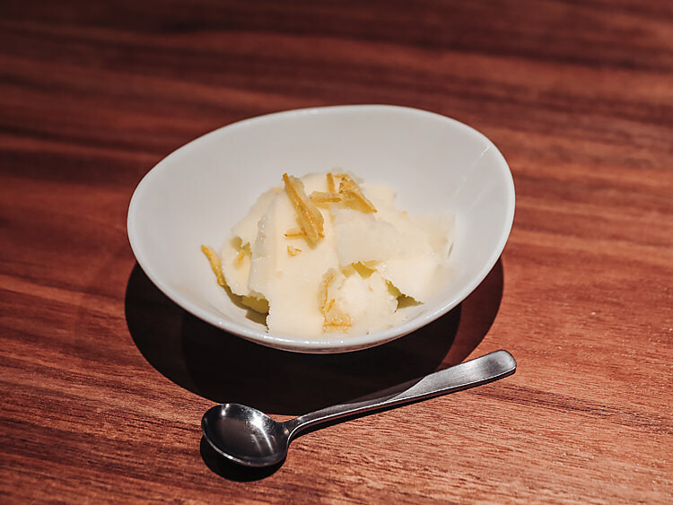 ゆずシャーベット。肉を食べたあとの口の中を、冷たく甘い食べ物でリセット。最後のお口直しにさっぱりとしたデザートが欲しい。お客様のご意見をいただきゆずシャーベット始めました。