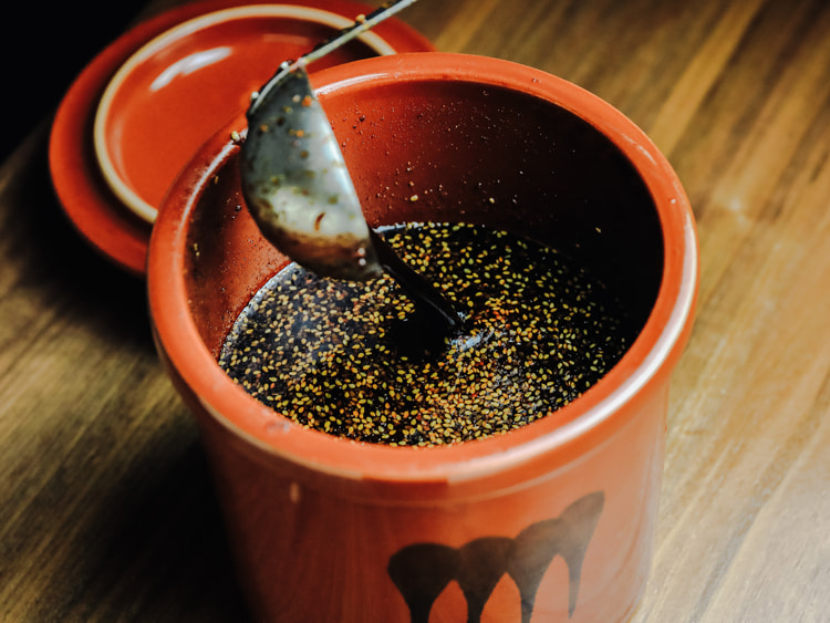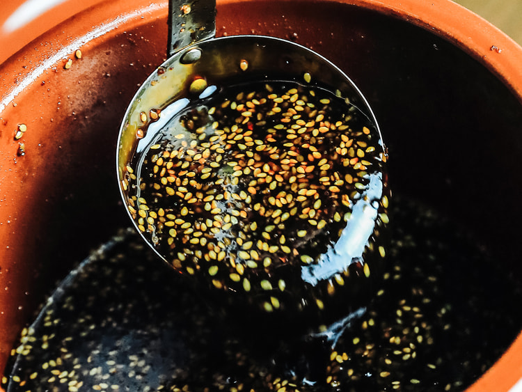 青森県産のにんにく、2種類の唐辛子、砂糖、味噌、ごまを独自の配合で調合し、松野醤油本醸造濃口醤油と合わせています。砂糖にはより純度の高いグラニュー糖をつかっているのもこだわりのひとつです。