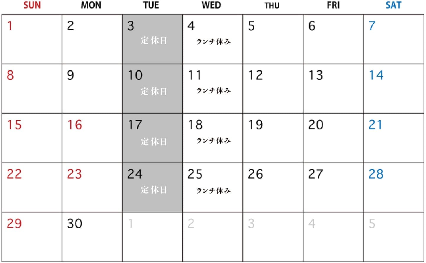 火曜日( ランチは火・水曜休み )