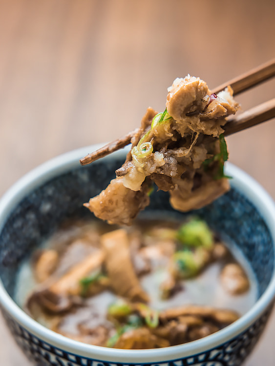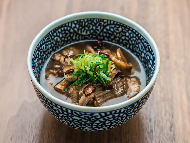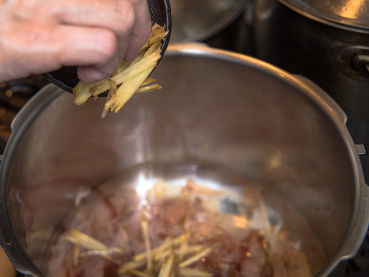 また、和風だしを煮込むときには、ショウガを加えて風味のアクセントを効かせています。ショウガは単に香りを足すだけではなく、ホルモンの脂の甘さを引き締め、全体のバランスをとる役割を果たします。そして最後に、ホルモンを丁寧に出汁へ投入し、じっくりと煮込むことで、すべての味わいが一体となった深いコクを生み出しています。