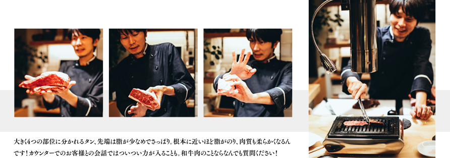 ですが、せっかくの特別なお食事、めいいっぱいお客様には焼肉を楽しんでもらいたいと考えています。その日の仕入れのオススメ部位のご案内。厚みを感じる食感がお好みであれば、厚めにカットいたします。脂多めが苦手なのか、歯ごたえのあるタンが好きなのか。同じ部位でも歯ごたえを強めするカットもできます。