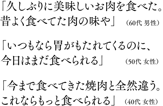 すべてにおいて理想だったものが雌牛(未経産)でした。特徴としては脂の融点が低く、口溶けが良いことが挙げられます。お客様からは「脂がサラサラしているように思う」「お腹いっぱいでもまだ食べられる」「次の日もたれなかった」という声を頂戴しますが、これらは雌牛(未経産)の良さをうまく言い表している感想だと思います。また、未経産牛は脂肪分が豊富なことも美味しさの理由のひとつです。脂肪は、熱を加えると溶け出し、肉に甘みやコクを与えます。