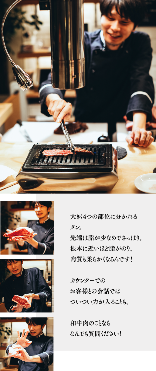 焼肉に携わって20年以上のプロのわたしがすべきことは、お客様の好みを感じ取り、「そう、こんな焼肉が食べたかった」「期待をこえる美味しさだった」という感情を導き出すことだと考えています。そしてそのために必要なことが「気配り」だと思うのです。