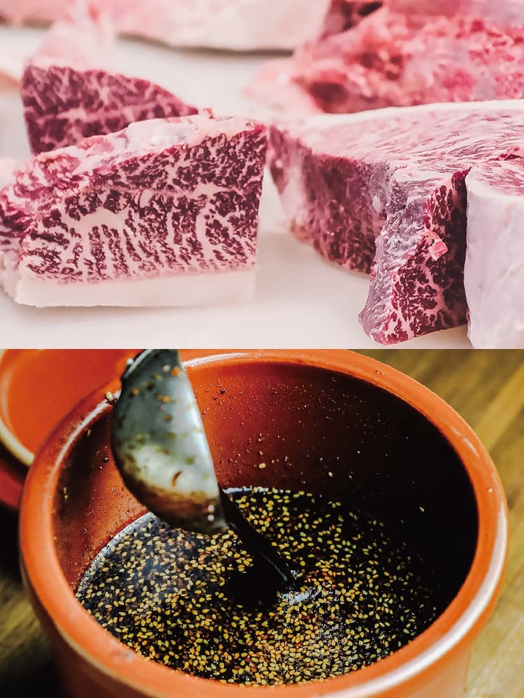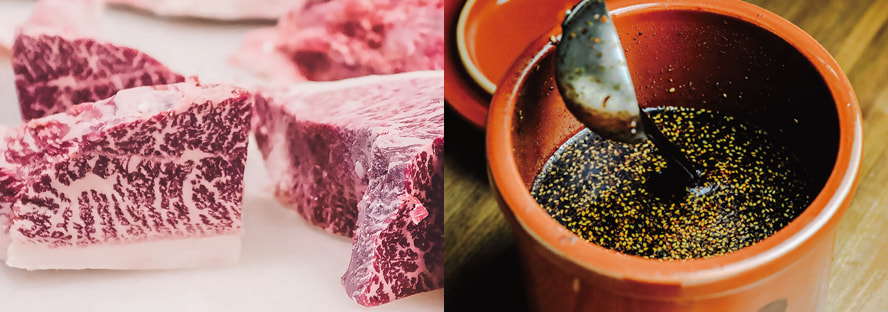 その枯らし熟成肉の旨味を引き出すには実は「醤油」がおすすめ。単なる醤油ではなく江戸時代から受け継がれた木樽で熟成させつくられる松野醤油の本醸造濃口醤油をベースに、青森県産にんにく、唐辛子2種、砂糖、味噌、ごま、をブレンドして仕上げた、枯らし熟成肉のための独自ブレンドの特製つけダレ。砂糖にはより純度の高いグラニュー糖を使っているのもこだわりのひとつ。